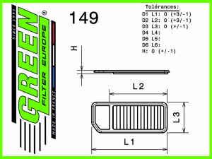 dit luchtfilter heeft de afmetingen D1/L1: 357mm - D2/L2: ──mm - D3/L3: 147mm - D4/L4: ──mm - D5/L5: ──mm en H= 23